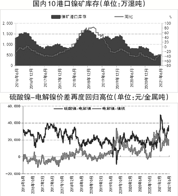 新能源產(chǎn)業(yè)鏈動能強勁。今年以來,為對沖新冠肺炎疫情對經(jīng)濟的影響,拜登政府連番推出財政刺激計劃,其中對新能源行業(yè)扶持意圖明確。全球各大車企銷量公布的數(shù)據(jù)顯示,新能源汽車在全球范圍內(nèi)銷量暴增,而鎳作為動力電池的核心材料之一,市場對其未來發(fā)展的信心再獲提振。從現(xiàn)貨端來看,電池級硫酸鎳較電解鎳價差再創(chuàng)高位。3月份因電解鎳價格劇烈回調(diào),電池級硫酸鎳較一級鎳(豆)溢價創(chuàng)近3年來新高,達4.6萬元/金屬噸。在經(jīng)歷4月份的回落以后,因終端需求強勁,電池企業(yè)大幅擴張年度排產(chǎn)計劃,導致硫酸鎳需求持續(xù)上漲,6月份硫酸鎳-電解鎳價差再度回歸至3萬元/噸以上,處于歷史相對高位。據(jù)測算,當兩者價差超過1.5萬元/噸的時候,三元前驅(qū)體企業(yè)采購鎳豆制備硫酸鎳就有利可圖,在此背景下,采購電解鎳制備硫酸鎳利潤豐厚,帶動上游鎳鹽、鎳豆迅速去庫存。