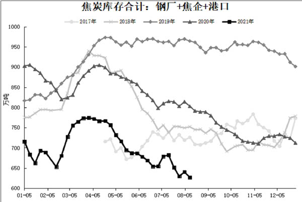 上周(8月9日~8月13日),焦煤、焦炭期貨主力已逐步換至1月合約。其中,焦炭J2201合約價格在2850元/噸~3000元/噸區間震蕩運行,焦煤JM2201合約價格在2150元/噸~2300元/噸區間震蕩運行。焦炭現貨方面,上周,各地主流鋼廠陸續表示已接受焦炭采購價格上調120元/噸。至此,焦價已連續提漲3輪,累計上漲360元/噸。而焦煤現貨價格同樣保持穩中有漲,受成本因素影響,焦化企業仍有進一步提漲焦價的意愿。焦炭港口貿易價格突破歷史新高,截至8月13日,日照港準一級冶金焦貿易出庫價格為3000元/噸,一級冶金焦貿易出庫價格為3100元/噸,環比前一周上漲150元/噸。