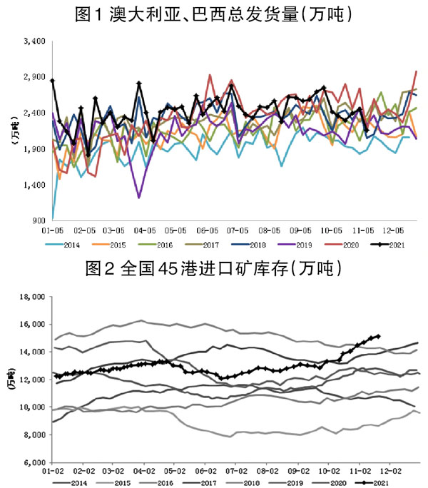 供應方面,主流礦山發運整體出現回落,同時到港量持續下降導致進口礦實際供給減少,符合供給端在鐵礦石價格大幅下跌后出現一定程度下降的預期。數據顯示,11月8日~14日,澳大利亞、巴西鐵礦石發運總量為2155.9萬噸,周環比減少293.5萬噸。其中,澳大利亞鐵礦石發運量為1547.4萬噸,周環比減少270.1萬噸;巴西發運量為608.5萬噸,周環比減少23.4萬噸。11月8日~14日,中國45港到港總量為2354.1萬噸,周環比減少65.7萬噸;北方6港到港總量為1176.7萬噸,周環比減少70.9萬噸。