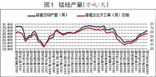進入10月份以后,錳硅周度產量迅速攀升,但鋼材產量出現見頂回落的情況。