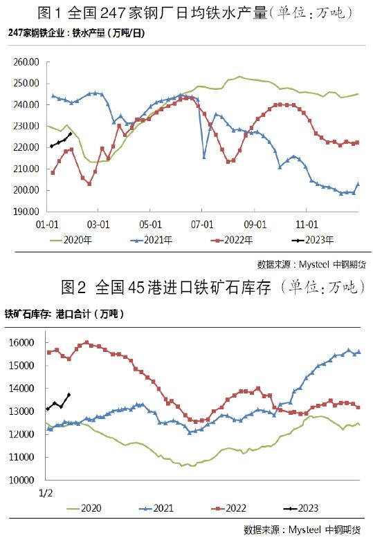 在需求方面,短期受終端需求弱及鋼廠利潤薄的影響,日均鐵水產(chǎn)量小幅回升但整體仍處于偏低水平(見圖1);春節(jié)假期鋼廠庫存消耗較多且?guī)齑骘@著低于歷史同期水平,后期存在一定的補庫需求。中期來看,房地產(chǎn)需求仍停留在預(yù)期層面,現(xiàn)實需求改善空間較小,鐵礦石中期需求難言樂觀。據(jù)調(diào)研,截至1月28日,全國247家鋼廠盈利面為32.47%,環(huán)比增長5.20%,同比減小50.65%;日均鐵水產(chǎn)量為226.57萬噸,環(huán)比增加2.83萬噸,同比增加7.22萬噸。