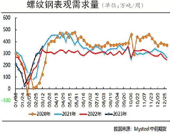 下游需求變化仍是影響鋼材價(jià)格的核心因素。3月9日,鋼聯(lián)公布鋼材周度數(shù)據(jù)后,螺紋鋼期貨價(jià)格迅速拉漲,熱卷期貨價(jià)格跟漲,帶動(dòng)整個(gè)黑色系金屬板塊反彈,螺紋鋼和熱卷主力合約價(jià)格分別創(chuàng)出本輪反彈以來的新高。3月3日—9日當(dāng)周,螺紋鋼表觀需求量為356.85萬噸,周環(huán)比增加47.46萬噸,同期去庫存53萬噸至1185.88萬噸。兩項(xiàng)數(shù)據(jù)均超出市場預(yù)期,表觀需求量的變化較之前一周提速,去庫存速度較之前兩周加快。