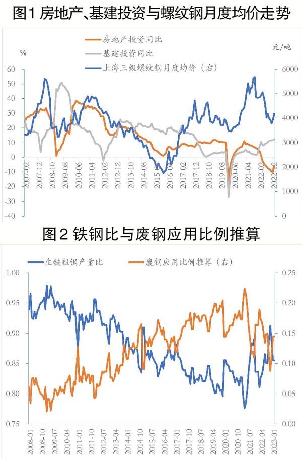 從全國兩會釋放出的信息來看,不論是上調(diào)財政赤字率,還是擴大政府專項債的規(guī)模,均反映出今年政策層面抓基建的決心還是比較大的。財政部在去年11月份就公布了今年可提前下達的地方專項債最高額度為2.19萬億元,占今年地方專項債額度的57%,提前下達的總額及占比均為近幾年來新高。若考慮到去年第四季度受疫情影響部分基建項目延后至2023年開工,今年基建投資保持7%~8%增速的問題不大。根據(jù)歷史上基建、房地產(chǎn)投資和螺紋鋼價格的關(guān)系來看,螺紋鋼價格與房地產(chǎn)投資相關(guān)性更高,這也支持了螺紋鋼價格短期有調(diào)整風(fēng)險的結(jié)論。