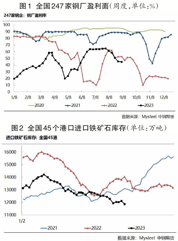 政策方面,政策端預期反復,市場對粗鋼平控政策執(zhí)行與否及執(zhí)行力度均產(chǎn)生疑慮。一方面,政策強調(diào)市場化機制調(diào)節(jié)。8月21日,工信部、國家發(fā)展改革委、財政部、自然資源部、生態(tài)環(huán)境部、商務部、海關(guān)總署等七部門聯(lián)合印發(fā)《鋼鐵行業(yè)穩(wěn)增長工作方案》,文件內(nèi)容指出要“形成需求牽引供給、供給創(chuàng)造需求的更高水平動態(tài)平衡”。近期房地產(chǎn)相關(guān)政策密集出臺,增強市場對終端需求增量的預期,在需求偏強的預期下,供給端將實現(xiàn)“動態(tài)平衡”,粗鋼平控政策落地的預期減弱。另一方面,長流程鋼廠在虧損狀態(tài)下依然維持高開工率,在市場化機制下,鐵礦石需求難以快速下滑。據(jù)相關(guān)機構(gòu)調(diào)研情況來看,8月初河北鋼廠螺紋鋼即期利潤轉(zhuǎn)為虧損,但日均鐵水產(chǎn)量不降反增。截至9月8日當周(9月4日—8日),日均鐵水產(chǎn)量(鋼聯(lián)口徑)創(chuàng)今年初以來的新高(248.24萬噸),較7月28日當周的240.69萬噸增加7.55萬噸(增幅為3.14%)。