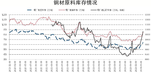 2023年是鋼材產能置換落地的大年,原料供給量亦有所增加,但由于2022年原料缺口較大,2023年供給雖然增加但原料的缺口仍在。進入2024年,鋼廠充分補庫,原料庫存重新回升。春節后原料價格有塌陷可能,可能帶動鋼材價格回落。