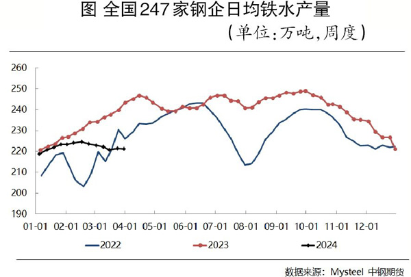 在需求端,鐵礦石需求回升速度明顯慢于往年同期。當前國內長流程鋼企復產力度不及預期,鋼企利潤不佳嚴重影響后續復產積極性,進而抑制國內鐵礦石需求,下游實際需求釋放速度緩慢且鋼企的生產利潤難有明顯的改善。自2024年初以來,鋼企日均鐵水產量持續處于225萬噸以下的低位水平,全國247家樣本鋼企盈利面持續小于30%。從鋼企的復產計劃來看,4月份仍有大量鋼企集中復產,預計日均鐵水產量將恢復至230萬噸~235萬噸水平。但目前鋼企利潤水平仍然偏低且終端需求恢復緩慢,鐵水產量存在不及預期的風險。