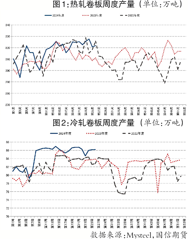 供應(yīng)方面,2024年上半年熱軋卷板供應(yīng)維持在相對高位,尤其在進入5月份后,熱軋卷板周度產(chǎn)量一直在320萬噸以上,比2023年同期增加10萬噸左右;冷軋卷板周度產(chǎn)量也攀升至86萬噸左右的水平,較去年同期的82萬噸~84萬噸有所增加。