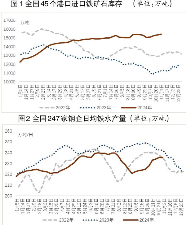 截至10月25日,全國45港口進鐵礦石到港量約為103132萬噸,累計同比增長5.8%;國內(nèi)332家礦山企業(yè)鐵精粉產(chǎn)量為19771萬噸,累計同比減少1.6%。