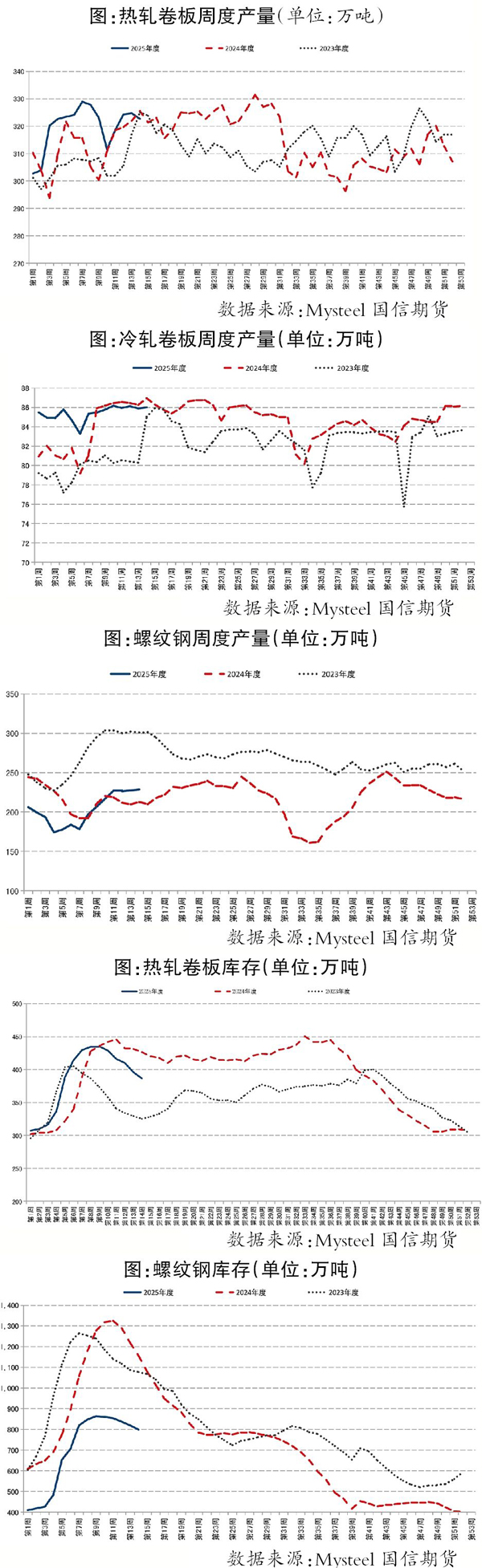 螺紋鋼產量在春節前主動減產,維持較低庫存,春節期間螺紋鋼庫存處于近幾年同期低位。隨著螺紋鋼產量回升,鋼材產量超過去年同期,考驗終端需求。
