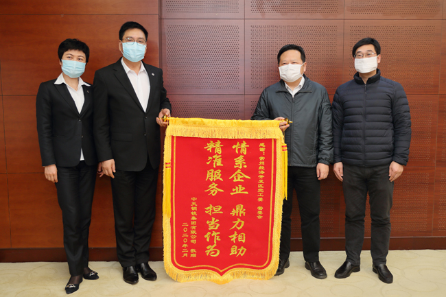 ?。苍拢玻度?,中天鋼鐵領導向常州市經濟開區黨工委送上錦旗,表示感謝(如圖)。新冠肺炎疫情發生以來,常州市經濟開發區想企業之所想、急企業之所急,多次赴中天鋼鐵現場辦公、深入調研,在防疫物資、物流運輸等方面,指導企業開展疫情防控工作,有效保障中天鋼鐵生產的正常有序。(記者 朱元潔 通訊員 陳明 攝)