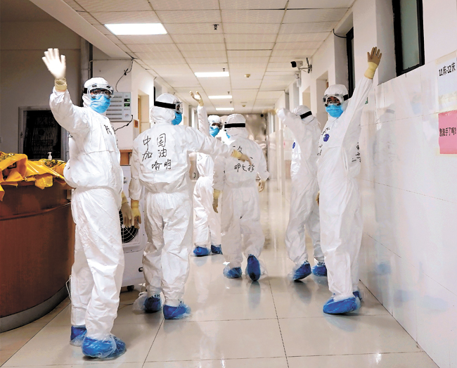 3月6日,新鋼中心醫院醫護人員圓滿完成了江西省新余市新冠肺炎患者的救治任務,醫務人員在對病區消毒、整理后,正式撤離至新余市袁河賓館開始集中隔離。自2月12日起,新鋼中心醫院17名醫護人員連續奮戰24天,采用中西醫結合的方法,成功救治新冠肺炎臨床診斷病例患者10名。圖為部分醫護人員向隔離病區揮手告別。 (歐陽斯娟 攝)