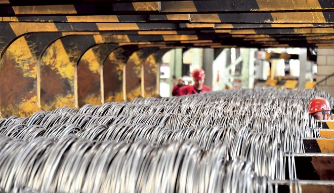 圖為沙鋼職工對線材表面質量進行檢查。(孫靜波 攝)