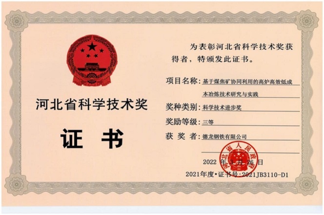 河北省科學技術獎勵委員會辦公室發布《關于2021年度河北省自然科學獎、技術發明獎、科學技術進步獎總評結果及河北省科學技術突出貢獻獎、河北省科學技術合作獎評審結果的公告》,德龍鋼鐵《基于煤焦礦協同利用的高爐高效低成本冶煉技術研究與實踐》項目榮獲2021年度河北省科學技術進步獎三等獎,實現鋼鐵民營企業第一完成單位“零”的突破,該獎項淘汰率在60%以上,是河北省政府對全行業技術創新工作的最高獎項,充分展示了德龍的綜合實力和行業地位,是品牌建設的重要支撐。