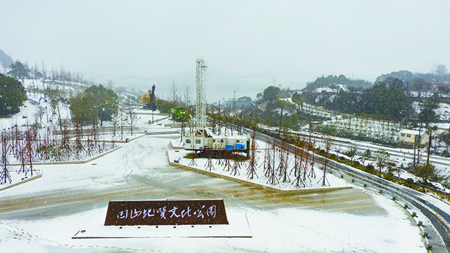 2月19日,中國寶武馬鋼凹山地質文化公園開園儀式在安徽省馬鞍山市雨山區舉行。據悉,凹山鐵礦資源開發于1917年,曾為馬鋼輸出超2億噸鐵礦石,有“馬鋼糧倉”“功勛礦山”等美譽。該礦于2017年閉坑,同時開啟生態修復。修復后建成的凹山地質文化公園占地6萬多平方米,主要由凹山坑觀景平臺、采礦設備展示區和百年南山歷史文化展示區3部分組成。圖為雪中的凹山地質文化公園。 (王愛兵 攝)