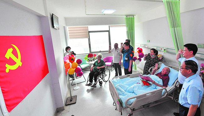 7月1日,中信重工領(lǐng)導(dǎo)來到河南洛陽新里程醫(yī)院為離休干部王金鐘慶祝100歲生日。據(jù)了解,王金鐘1922年7月1日出生,1938年加入中國共產(chǎn)黨,有著84年黨齡。他曾親歷抗日戰(zhàn)爭、解放戰(zhàn)爭、抗美援朝戰(zhàn)爭,1956年進入洛陽礦山機器廠工作。據(jù)老人的親屬說,王金鐘老人一直保持著共產(chǎn)黨員艱苦樸素的作風(fēng),一輩子沒過過生日。去年7月1日,老人第一次吐露了心聲:希望到100歲時,和黨一起過生日。圖為王金鐘在女兒的協(xié)助下莊嚴舉起右手,與現(xiàn)場黨員們一起重溫入黨誓詞。(黃政偉 攝)