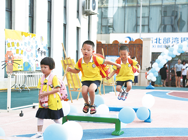 9月5日,是柳鋼資產公司教育集團旗下7所幼兒園秋季開學第一天。新學期新起點,萌娃們在家長的陪同下,元氣滿滿地踏入幼兒園大門。點朱砂、跨欄、發放升班通行卡、交通安全教育……多所幼兒園準備了各種儀式感滿滿的活動、形式多樣的“開學第一課”。圖為柳鋼一品江山幼兒園萌娃們歡快地跨過成長欄。(閻翔/文 王潤雨 /攝)