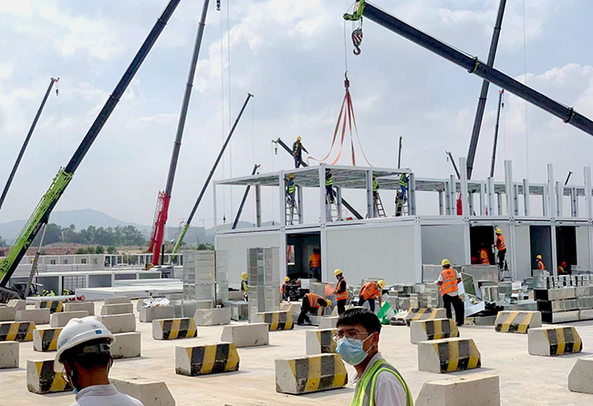 11月,廣州市新冠肺炎疫情形勢嚴峻,疫情處置處于關鍵階段。中國寶武中南鋼鐵緊急支援廣州市方艙醫院建設,11月12日~20日,先后向芳村、黃埔、南沙方艙醫院配送46車1554噸鋼材,實現8小時到貨,助力廣州市打贏疫情防控阻擊戰。圖為方艙醫院建設現場。(陳立新/文 羊凌穎/攝)