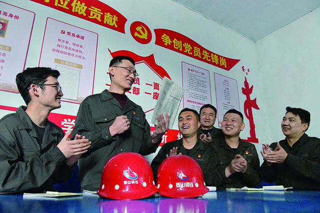 3月21日上午,山東泰山鋼鐵集團煉鐵部原料廠機電車間維修班的活動室里,班長張國勝利用休息時間向工友們宣講起十四屆全國人大一次會議精神。不久前,全國人大代表,泰山鋼鐵集團董事長、黨委書記王永勝在泰鋼召開了十四屆全國人大一次會議精神報告會,在全公司掀起了貫徹落實會議精神的熱潮。張國勝在學習后感到信心更滿、干勁更大了,他表示,“我是一名基層工人,應將自己的本職工作與企業發展大局緊密結合,全面提升能力,踏實干好本職工作,更要團結帶領大家把兩會精神充分融入到下一步工作當中,為實現中華民族偉大復興中國夢貢獻一份力量。”(李文樹 攝)