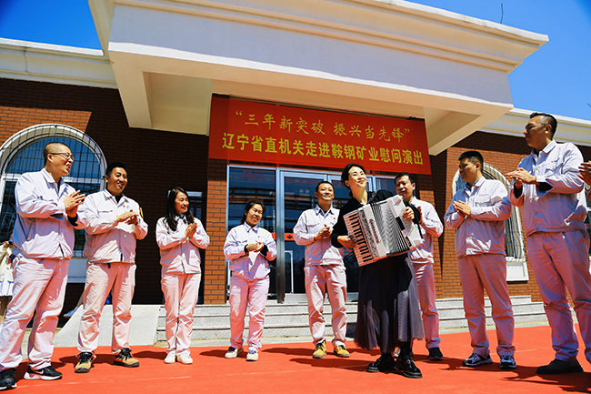 在“五一”國際勞動節(jié)前夕,4月26日,“三年新突破 振興當(dāng)先鋒”遼寧省省直機(jī)關(guān)走進(jìn)鞍鋼礦業(yè)慰問文藝小分隊,深入到齊大山選礦廠過濾作業(yè)區(qū)隔膜泵廠房和齊大山鐵礦職工食堂,為一線職工送上精彩的演出(如圖)。演出匯聚了合唱、京劇 、器樂演奏、相聲等多種藝術(shù)形式,演員們聲情并茂的表演,引發(fā)了一線職工的強(qiáng)烈共鳴,現(xiàn)場氛圍熱烈,掌聲陣陣。(杜慶剛 攝)