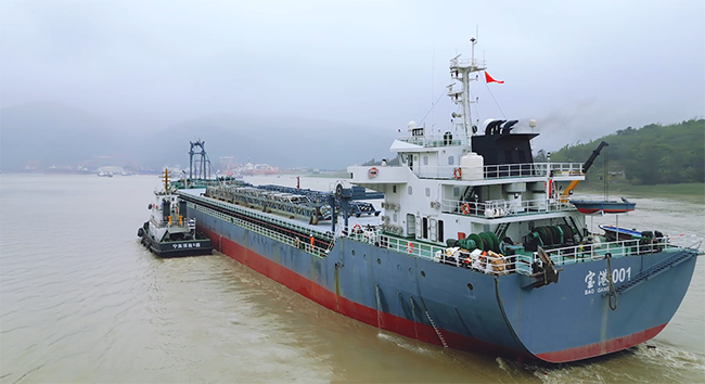 “寶港001”“寶港002”輪是寶武資源與京港遠洋公司根據利比里亞bomi項目鐵礦石運輸需求打造的過駁船,可為大型散貨船舶提供過駁裝載服務,有效提高出貨效率,節省遠洋物流成本。這對增強Bomi項目的經營效能、提高競爭力具有重要作用。圖為寶港001輪下水場景。(吳磊 供圖