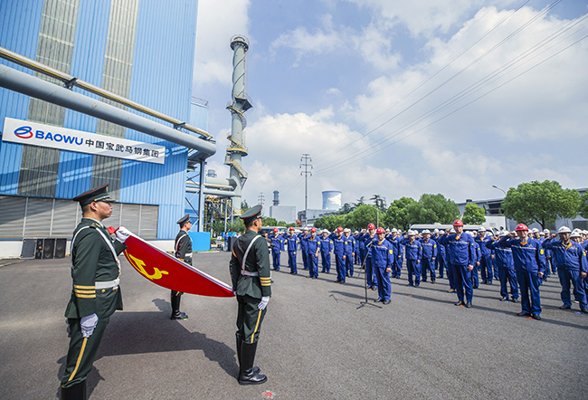 8月19日,中國寶武馬鋼集團舉行“8·19”系列活動,進一步貫徹落實2020年8月19日習近平總書記考察調研馬鋼重要講話精神,回顧三年來馬鋼牢記囑托、感恩奮進的新作為,把握機遇、順勢而上的新變化,激勵廣大干部職工時刻牢記習近平總書記殷殷囑托,擼起袖子加油干,風雨無阻向前行。圖為在馬鋼特鋼公司優質合金棒材生產線廠房外,馬鋼集團黨委書記、董事長丁毅領誓重溫入黨誓詞。(特約通訊員 羅繼勝 攝)