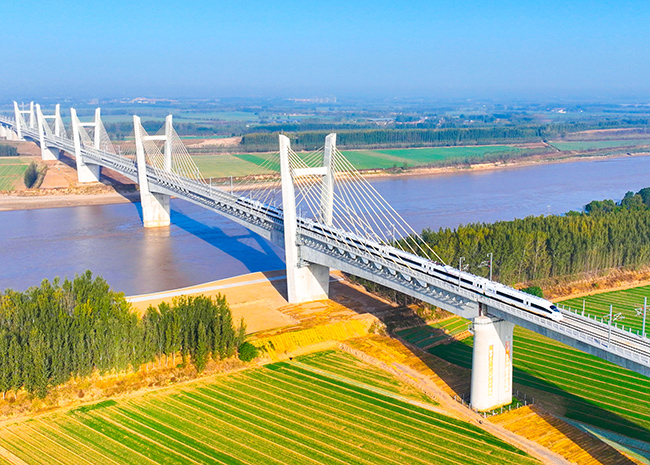 11月6日,一列高鐵測試車駛過濟鄭高鐵長清黃河特大橋(如圖)。日前,山東濟南至鄭州高速鐵路濟南至濮陽段聯調聯試工作結束,正式進入運行試驗階段。自該項目開工建設以來,山鋼1.3萬余噸H型鋼、螺紋鋼產品用于鐵路接觸網支柱、沿途黃河大橋等工程建設。據了解,濟鄭高鐵設計時速350公里,全長約407公里,其中山東段全長170公里。全線建成通車后,鄭州到濟南通行時間將縮短至1.5小時,成為中原城市群與山東半島城市群間的快速客運通道。(特約通訊員 李建輝 攝)