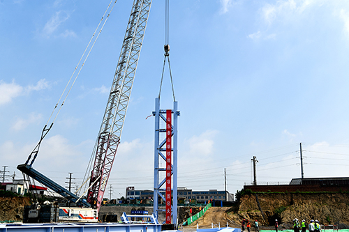 泰鋼精品鋼項目主廠房鋼結(jié)構(gòu)首根立柱吊裝就位