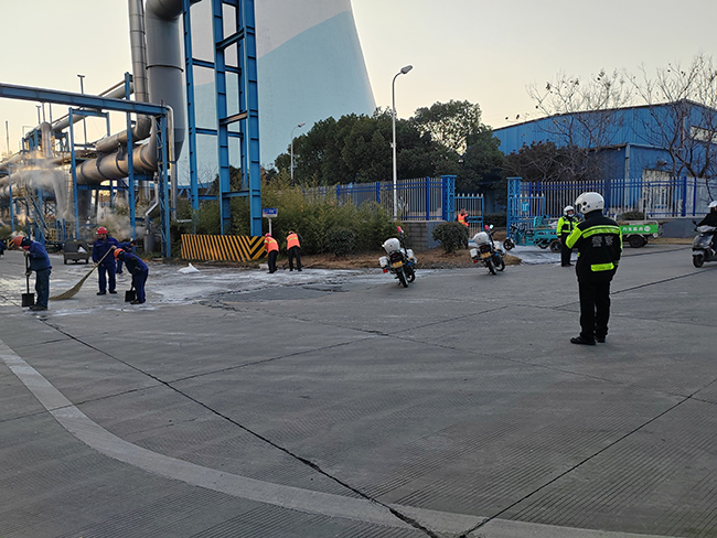 1月23日凌晨6時許,馬鋼北區二廠西路交叉路口由于冷卻塔上凍水溢流淌,造成路面大面積結冰,致使該路段形成較大的交通安全隱患,馬鋼保衛部交管巡邏大隊緊急抽調隊員對現場進行安全管控,指揮過往行人、電瓶車及貨運車輛緩慢通行,至7時30分,在交巡隊員與該廠作業人員和現場環衛工人一同鏟除結冰、撒鹽消融后恢復正常通行。(記者 章利軍/文 通訊員 張新勇/攝)
