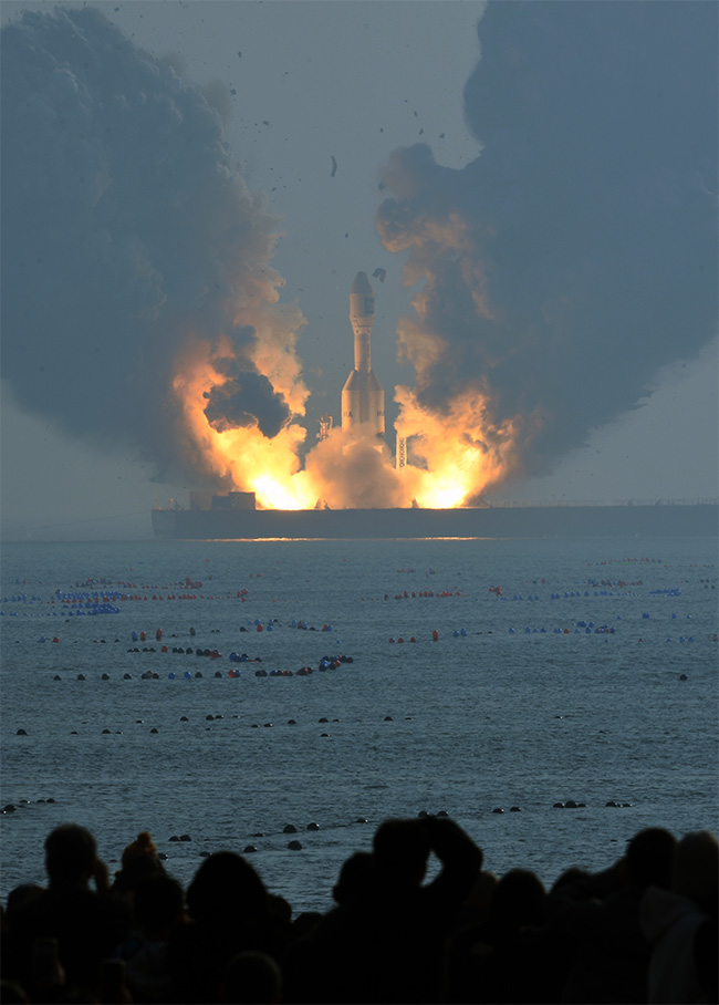 1月11日,人們在山東省海陽市連理島上觀看海上火箭發射(如圖)。1月11日13時30分,我國太原衛星發射中心在山東海陽附近海域使用“引力一號”遙一商業運載火箭,將搭載的云遙一號3顆衛星順利送入預定軌道,飛行試驗任務獲得圓滿成功。為此次發射承擔運輸任務的液壓動力模塊運輸車(SPMT)是寶鋼工程旗下蘇州大方特種車股份有限公司自主研發的,適用于石油化工、船舶大型分段、公鐵預制橋梁、高爐等領域的超大物件運輸。(李紫恒 攝)