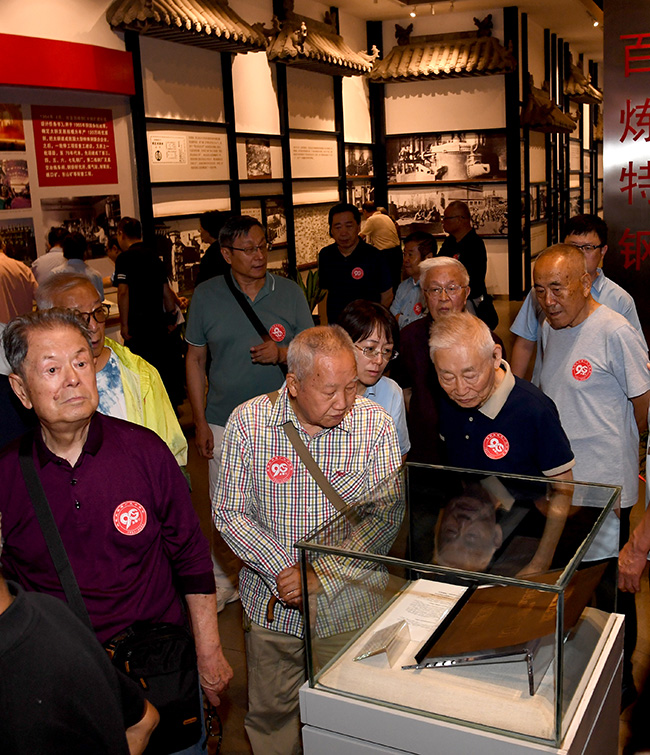 8月8日是太鋼建廠90周年。1934年8月8日,西北煉鋼廠(太鋼前身)正式開工建設;1952年9月份,太鋼冶煉出新中國第一爐不銹鋼。1952年~2023年,太鋼累計生產不銹鋼6700多萬噸,為國民經濟和社會發展做出了重要貢獻。2020年12月23日,太鋼正式加入中國寶武大家庭。目前,太鋼擁有太原基地、寶鋼德盛(托管)、山東鑫海、寧波寶新、太鋼天管5個鋼鐵制造基地,具有年產2000萬噸鋼,包括1000萬噸不銹鋼的生產能力。圖為8月8日,太鋼老同志在太鋼博物園展廳觀看太鋼1952年2月28日生產的“新中國第一張0.3毫米熱軋薄板”復制品(原件現藏于中國國家博物館)。(記者 王旭宏 攝)