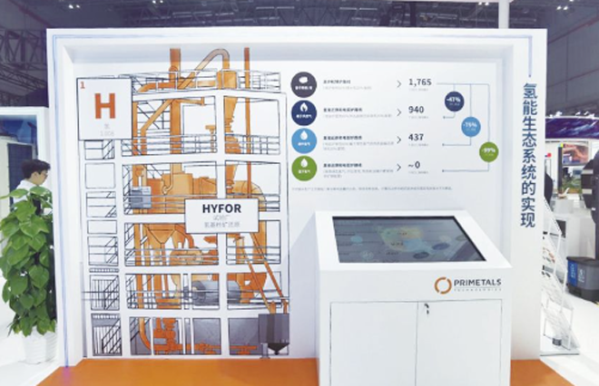同樣展現(xiàn)了冶金行業(yè)低碳未來(lái)的,還有普銳特冶金技術(shù)公司。其展臺(tái)設(shè)置展板,對(duì)比顯示了不同鋼水生產(chǎn)工藝路線二氧化碳的排放量,并演示了其正在試運(yùn)行的HYFOR試驗(yàn)廠生產(chǎn)流程。