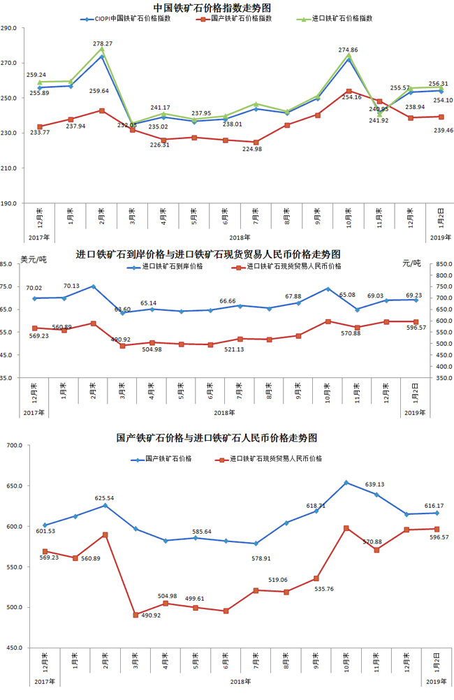 1月2日,中國鐵礦石價格指數(CIOPI)254.10點,環比上升0.71點,升幅為0.28%。其中:國產鐵礦石價格指數為239.46點,環比上升0.52點,升幅為0.22%;進口鐵礦石價格指數為256.31點,環比上升0.74點,升幅為0.29%。