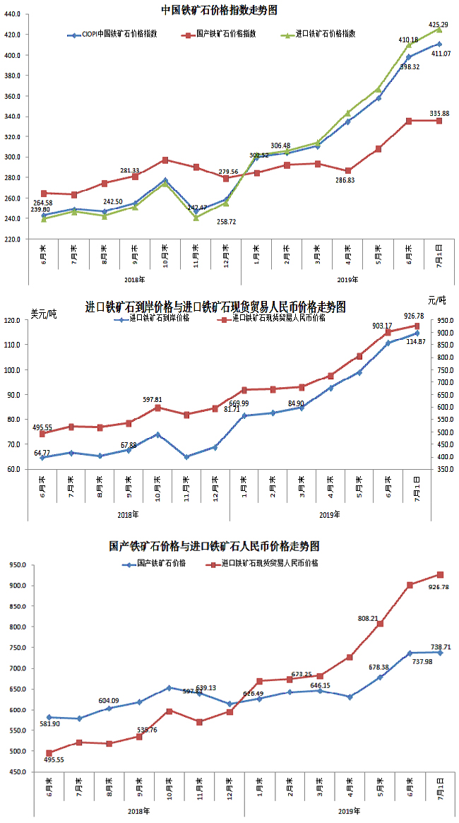 7月1日,中國鐵礦石價格指數(shù)(CIOPI)411.07點(diǎn),環(huán)比上升12.76點(diǎn),升幅為3.20%。其中:國產(chǎn)鐵礦石價格指數(shù)為335.88點(diǎn),環(huán)比上升0.33點(diǎn),升幅為0.10%;進(jìn)口鐵礦石價格指數(shù)為425.29點(diǎn),環(huán)比上升15.11點(diǎn),升幅為3.68%。