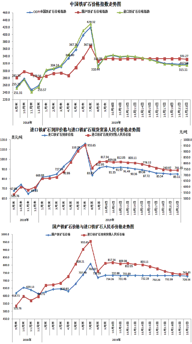 10月22日,中國鐵礦石價格指數(shù)(CIOPI)317.68點,環(huán)比上升0.41點,升幅為0.13%。其中:國產(chǎn)鐵礦石價格指數(shù)為331.27點,環(huán)比下降1.54點,降幅為0.46%;進口鐵礦石價格指數(shù)為315.11點,環(huán)比上升0.78點,升幅為0.25%。