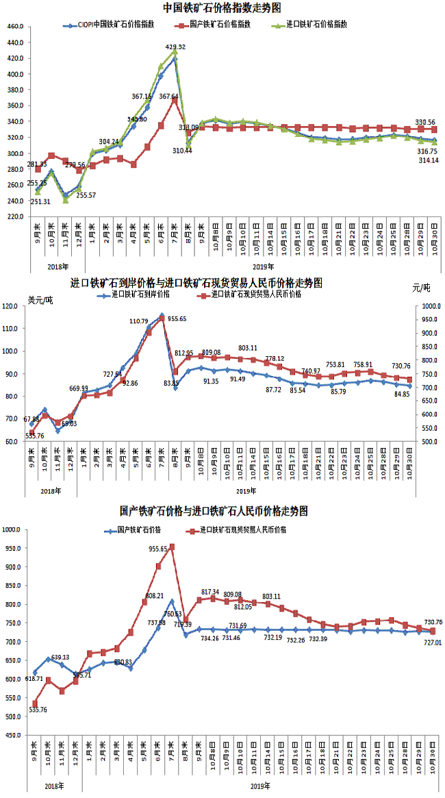 10月30日,中國鐵礦石價格指數(CIOPI)316.75點,環比下降1.61點,降幅為0.51%。其中:國產鐵礦石價格指數為330.56點,環比下降0.53點,降幅為0.16%;進口鐵礦石價格指數為314.14點,環比下降1.81點,降幅為0.57%。