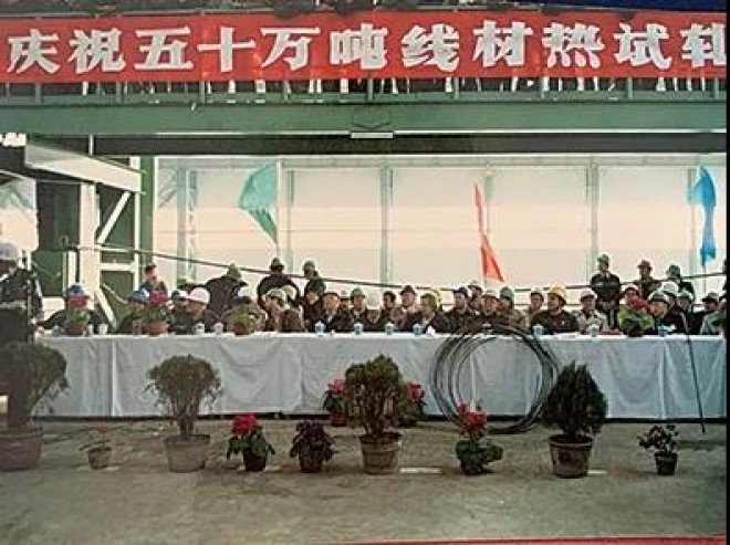 右圖為1987年4月15日鞍鋼線材股份有限公司50萬(wàn)噸線材軋機(jī)熱試扎成功。(鞍鋼線材 供圖)