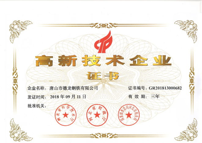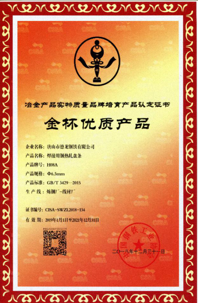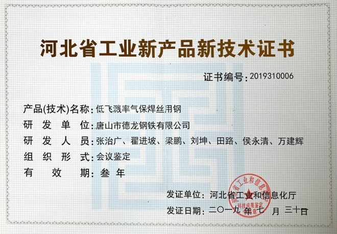 現(xiàn)在,唐山德龍已經(jīng)獲專利授權(quán)78項,其中發(fā)明專利24項,實用新型專利54項;擁有省、市、國家優(yōu)秀質(zhì)量管理成果60余項,市級優(yōu)秀技術(shù)創(chuàng)新成果一等獎2項、二等獎2項、三等獎3項,省工信廳認定新產(chǎn)品2項,省重點研發(fā)項目1項,省冶金科學(xué)技術(shù)二等獎2項、三等獎4項,卓越產(chǎn)品認證2項,金杯產(chǎn)品認證4項(H08A、H08E、H10Mn2、ER70S-6)。多項技術(shù)達到國際先進、國內(nèi)領(lǐng)先水平。公司被評為國家高新技術(shù)企業(yè)、河北省技術(shù)創(chuàng)新示范企業(yè)、河北省創(chuàng)新引領(lǐng)型領(lǐng)軍企業(yè)。