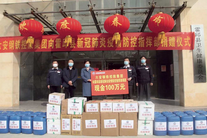 圖為在疫情防控期間六鋼向安徽省六安市霍邱縣疫情防控指揮部捐贈抗疫物資。(六鋼供圖)