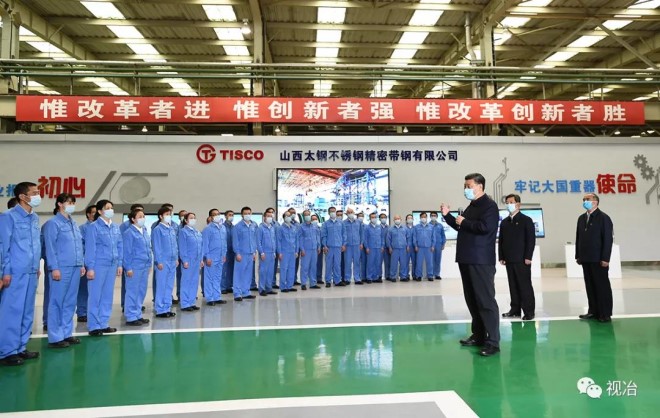 2020年5月11日至12日,中共中央總書記、國家主席、中央軍委主席習(xí)近平在山西考察。這是5月12日上午,習(xí)近平在太鋼不銹鋼精密帶鋼有限公司生產(chǎn)車間考察時,同企業(yè)職工親切交流。(新華社記者 謝環(huán)馳 攝)
