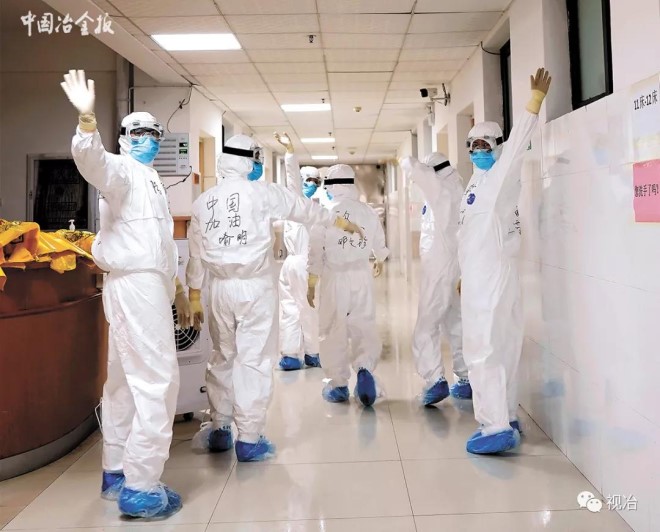 2020年3月6日,新鋼中心醫(yī)院醫(yī)護(hù)人員圓滿完成了江西省新余市新冠肺炎患者的救治任務(wù),醫(yī)務(wù)人員在對病區(qū)消毒、整理后,正式撤離至新余市袁河賓館開始集中隔離。圖為部分醫(yī)護(hù)人員向隔離病區(qū)揮手告別。(歐陽斯娟 攝)