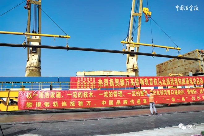 2020年11月28日上午10時30分,由鞍鋼集團(tuán)攀鋼和廣西北部灣國際港務(wù)集團(tuán)共同主辦的雅萬高鐵長定尺鋼軌出口首航儀式在北部灣舉行(如圖)。據(jù)悉,雅萬高鐵是中國高鐵全系統(tǒng)、全要素、全生產(chǎn)鏈走出國門的“第一單”,也是“一帶一路”的標(biāo)志性工程。攀鋼鋼軌以優(yōu)異的品質(zhì)、最佳的技術(shù)營銷服務(wù)和最可行的物流運(yùn)輸解決方案,贏得雅萬高鐵項(xiàng)目全部供軌訂單,供貨總量達(dá)38000噸。(王訓(xùn)華/文 張瑜/ 攝)