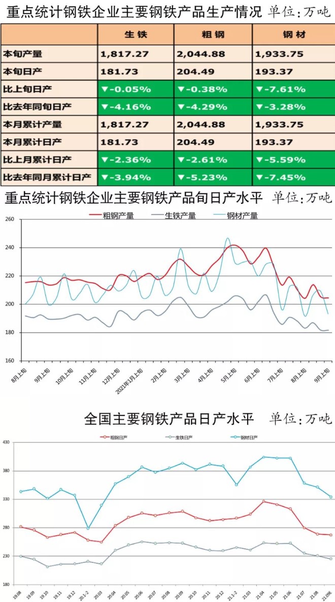 9月上旬,重點(diǎn)統(tǒng)計(jì)鋼鐵企業(yè)共生產(chǎn)粗鋼2044.88萬噸、生鐵1817.27萬噸、鋼材1933.75萬噸。其中,粗鋼日產(chǎn)204.49萬噸,環(huán)比下降0.38%;生鐵日產(chǎn)181.73萬噸,環(huán)比下降0.05%;鋼材日產(chǎn)193.37萬噸,環(huán)比下降7.61%(受鞍鋼集團(tuán)ERP取數(shù)原則和部分企業(yè)月底集中入庫等因素影響,本旬鋼材產(chǎn)量相比上一旬減少較多。剔除這些因素,本旬鋼材產(chǎn)量比上一旬下降4.0%)。
