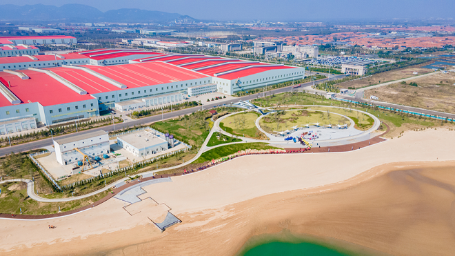 “通過設計優化,將成品碼頭與陸地之間原用于填海造地的30多公頃海域保留了下來,同時保留了珍貴的自然岸線,以此為基礎建設了沙灘公園,真正體現了節約資源、保護資源的責任擔當,踐行了人與自然和諧共生的綠色發展方式,展現出了自然生態文明與現代工業文明交相呼應的美好畫面?!闭驹邳S海之濱的海邊金沙灘,聶延忠介紹,如果環保做不好,藍天碧海金沙灘就會消失不見,沙灘公園就會變成垃圾場。