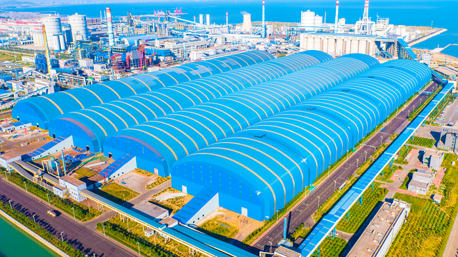 “原料場主要承擔日照公司各種大宗原燃物料的接卸、儲存、供應任務。接卸及中轉的物料種類近20種,年中轉量2000多萬噸,平均作業率85%以上。物料實現全封閉管理,一個封閉儲煤棚,儲煤量20多萬噸;兩個儲礦棚,儲存量130多萬噸?!甭櫻又医榻B。