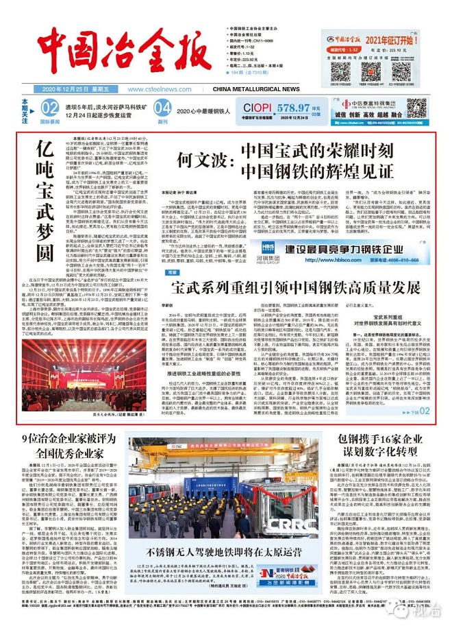 ▲2020年12月25日《中國冶金報》刊發(fā)的中國寶武年產(chǎn)鋼量突破1 億噸的報道