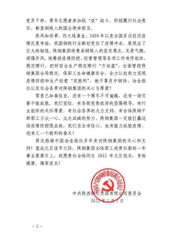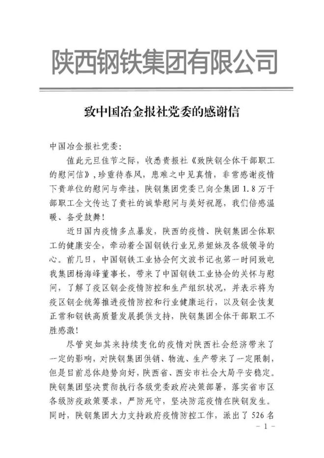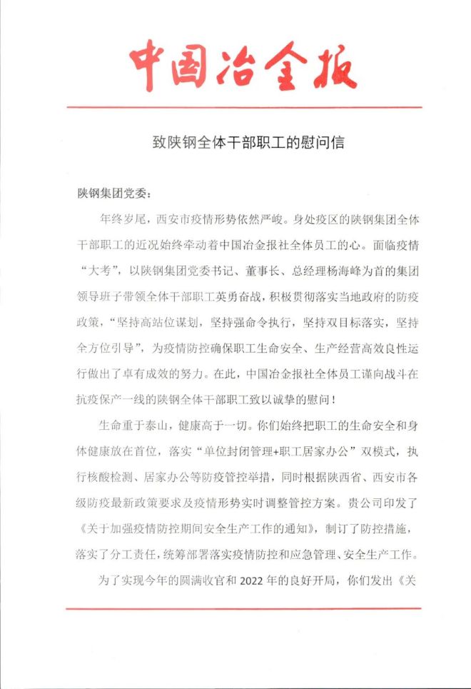 年終歲尾,西安市的疫情仍然嚴峻。中國冶金報社心系身處疫區的陜鋼集團,以一封信向積極落實防疫政策、在抗疫保產一線英勇抗戰的陜鋼員工們致以誠摯的慰問。