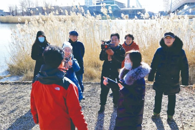 圖為《中國冶金社》記者在首鋼滑雪大跳臺前采訪市民。