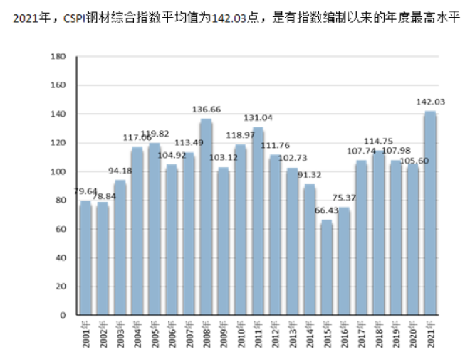 2021年,全國粗鋼產量10.33億噸,同比下降3.0%;全球粗鋼產量19.5億噸,中國占比52.9%。2021年,全國鋼材出口量6690萬噸,同比增長24.6%;鋼材進口量1427萬噸,同比下降29.5%。2021年,全國粗鋼表觀消費量9.92億噸,同比減少5578萬噸,降幅5.3%。2021年12月末,重點統計企業鋼材庫存1130萬噸,同比減少32萬噸,降幅為2.8%;全國主要鋼材市場五種鋼材(中板、冷軋薄板、熱軋薄板、線材和螺紋鋼)社會庫存量為776萬噸,同比增加46萬噸,增幅為6.3%。2021年,CSPI鋼材綜合指數平均值為142.03點,同比增長32.93%。2021年末,螺紋鋼價格為4604元/噸(2020年為4236元/噸,2019年為3733元/噸);熱軋卷板價格為4823元(2020年為4663元/噸,2019年為3953元/噸)。2021年,我國累計進口鐵礦石11.24億噸,同比下降3.9%,進口均價高達164.3美元/噸。2021年12月末,全國進口鐵礦石港口庫存量為1.56億噸,與2019年3月的前期高點1.47億噸相比,增加923萬噸。2021年12月末,巴西和西澳至青島的海運費分別為22.2美元/噸和8.8美元/噸,同比分別上漲38.0%和8.3%。2021年,重點統計鋼鐵企業營業收入69308億元,同比增長32.7%;利潤總額3524億元,同比增長59.7%;銷售利潤率5.1%,同比上漲0.9個百分點;年末資產負債率為 60.80%。2021年,我國重點統計鋼企外排廢氣中二氧化硫排放總量同比下降21.15%,顆粒物排放總量同比下降15.16%,氮氧化物排放總量同比下降13.89%;噸鋼二氧化硫排放量同比下降21.01%,噸鋼顆粒物排放量同比下降13.71%,噸鋼氮氧化物排放量同比下降12.91%。