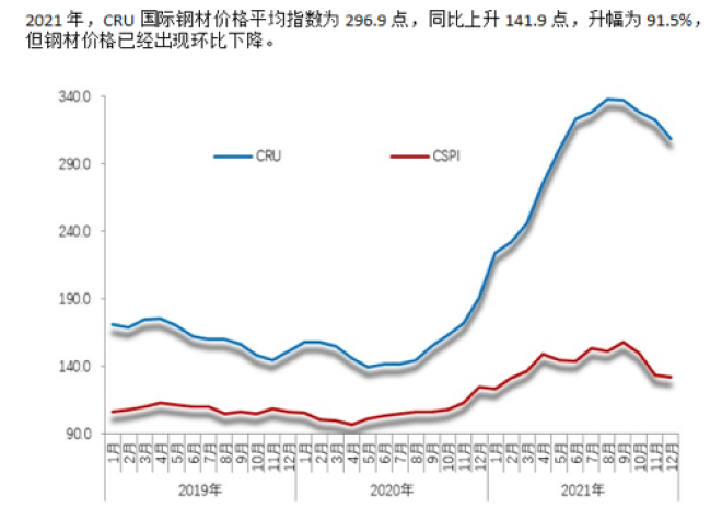 值得注意的是,從2021年鋼鐵行業整體運行情況來看,行業發展要重點關注三個問題:一是如何以充分的產能適應需求變化的彈性。2021年上半年,供需基本動態均衡主要得益于鋼材市場旺盛的需求;下半年市場需求收縮,實現供需基本動態均衡主要得益于政府部門采取的產能產量“雙控”措施。未來,市場需求變化的不確定性依然存在,保持供需基本動態均衡關系到行業平穩運行,而解決這個問題的關鍵是堅持法制化、市場化原則,既希望保持政策的連續性、穩定性和政策措施的進一步優化,更需要加強行業加強自律,共同維護市場秩序,推動鋼鐵行業高質量發展。二是行業效益月度波動較大。2021年,鋼材市場階段性需求的快速變化、原燃料價格超常規上漲并高位波動、鋼材價格創紀錄的沖高及后期的明顯回落,以及產能利用率波動帶來的工序間能源平衡失配、固定費用攤薄等多重因素疊加導致的企業運行成本升高,給鋼鐵行業的穩定運行造成了巨大沖擊,致使行業效益月度波動較大。三是國際鋼產量增長明顯,國際鋼材市場價格已開始下行。2021年前11個月,除中國外,國際鐵、鋼產量同比增幅均超過10%。2021 年,CRU 國際鋼材價格平均指數為 296.9 點,同比上升 141.9 點,升幅為 91.5%,但鋼材價格已經出現環比下降。
