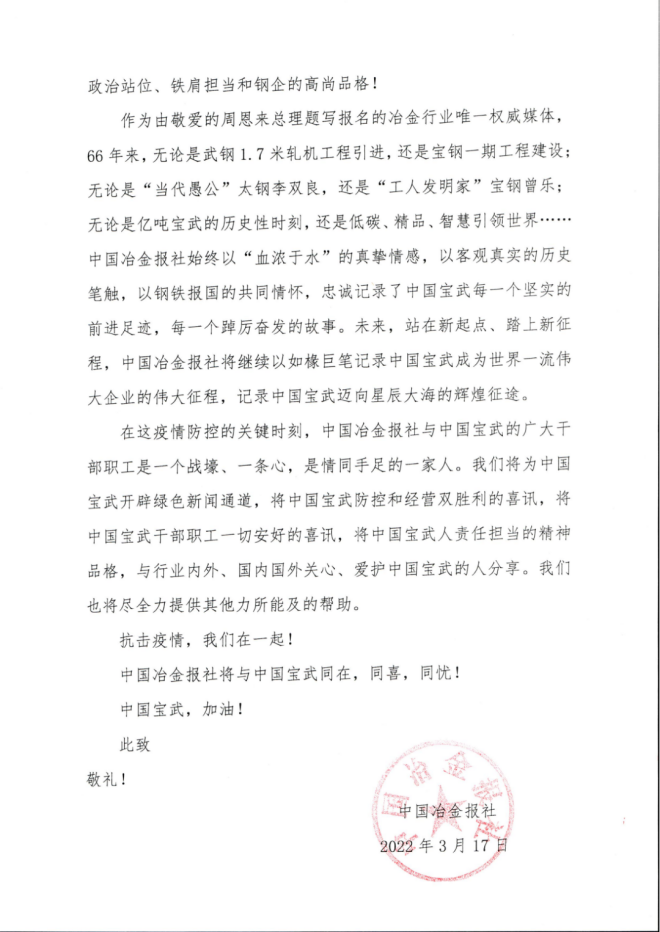 為此,中國寶武發來感謝信,表示在抗擊新冠肺炎的關鍵時刻,中國冶金報社送來的誠摯問候,給予了中國寶武莫大的溫暖與支持。一直以來,中國冶金報及其新媒體緊貼寶武的大發展、大變革,在深度報道、領導人專訪等方面提供了行業媒體專業、持續的服務,作了大量富有成效的宣傳工作,為加強行業宣傳工作、重塑鋼鐵行業形象,報道、詮釋寶武發展對鋼鐵行業高質量發展的引領示范意義起到了積極的作用,也與寶武廣大干部員工建立了深厚的情誼。中國寶武期待未來與中國冶金報社進一步加強交流與合作,共同開創中國鋼鐵業更加美好的明天!